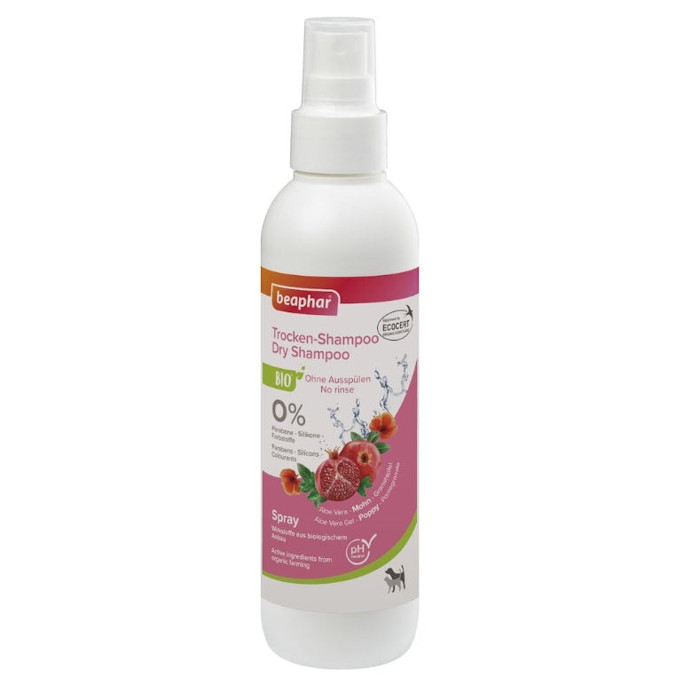 The Beaphar Dry Shampoo for dogs and cats cleans the coat without rinsing. The shampoo contains aloe vera gel from organic farming, which moisturizes the skin and softens the coat. The Ecocert label guarantees the natural origin of the ingredients used. The spray, enriched with poppy and pomegranate, cleans and nourishes the coat. It restores the suppleness of the hair and enhances the shine. The neutral pH value of this dry shampoo respects your animal's coat.