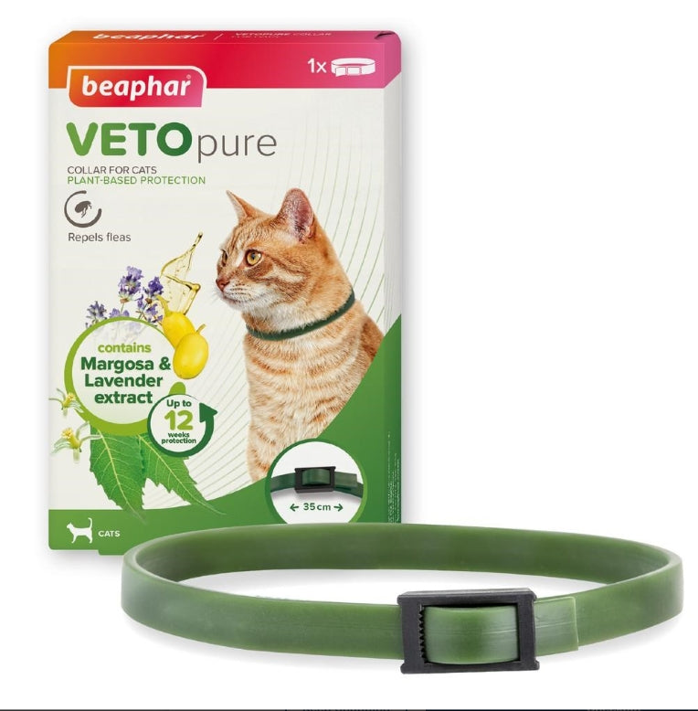One Beaphar VETOpure Flea Collar for Cats will last up to 12 weeks. The collar is 35cm long and will fit most cats. Simply slide the free end through the buckle, and tighten to give a comfortable fit. Cut off any excess collar with scissors and throw it away with the domestic rubbish. If fitted to a fully grown cat, allow enough space for 2 fingers to be inserted between the collar and neck. If fitted to a growing cat, remember to loosen the collar as the cat gets bigger. The collar requires around 5-7 days to reach its optimal effect. The properties of the collar will not be affected by water or moisture.