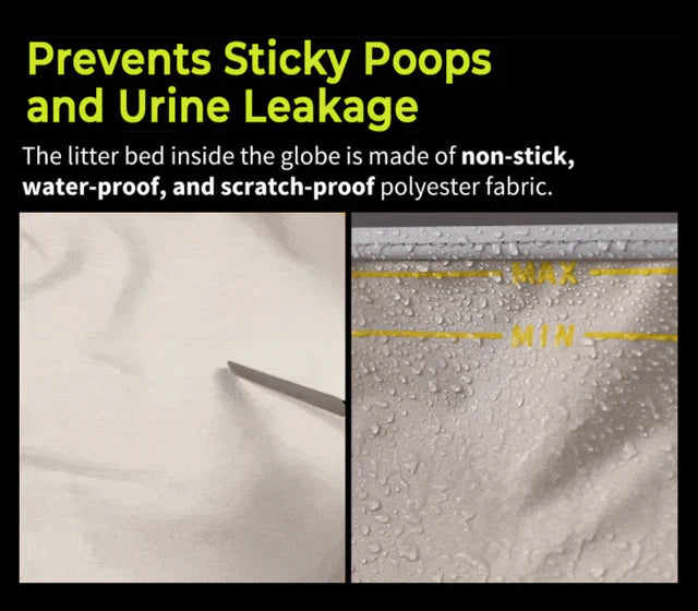 Prevents Sticky Poops and Urine Leakage. The litter bed inside the globe is made of non-stick, waterproof, and scratch-proof polyester fabric. The built-in sealing strip around the litter bed helps to prevent urine leakage.