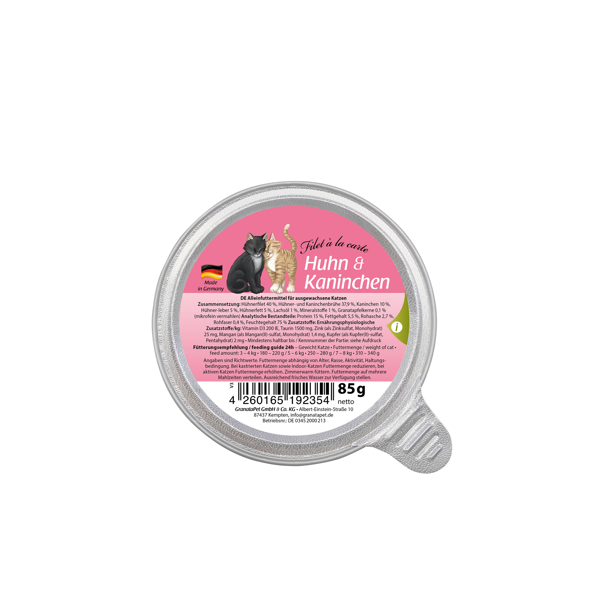 GranataPet Filet à la carte 湿粮 是一种美味的全食物配方,由嫩鱼片制成。配方富含优质鲑鱼油和石榴籽。这种优质天然湿粮用其自身的汁液轻轻烹制,特别美味且易于消化。鲑鱼油可保护猫的皮肤,并确保其毛发光滑有光泽。该产品还含有矿物质、牛磺酸和其他活力成分,使这种多汁的配方成为均衡的全食物。
