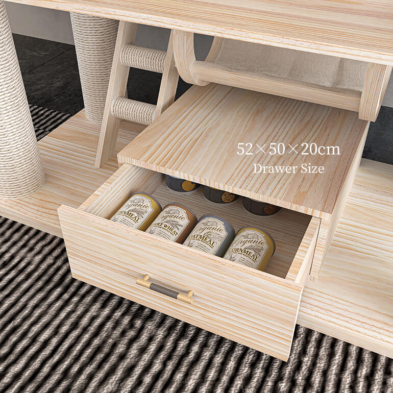 Comes with built-in drawers, offering easy storage for your feline's treats, toys, and other belongings. Keep everything neatly organized and within reach for their enjoyment and playtime.