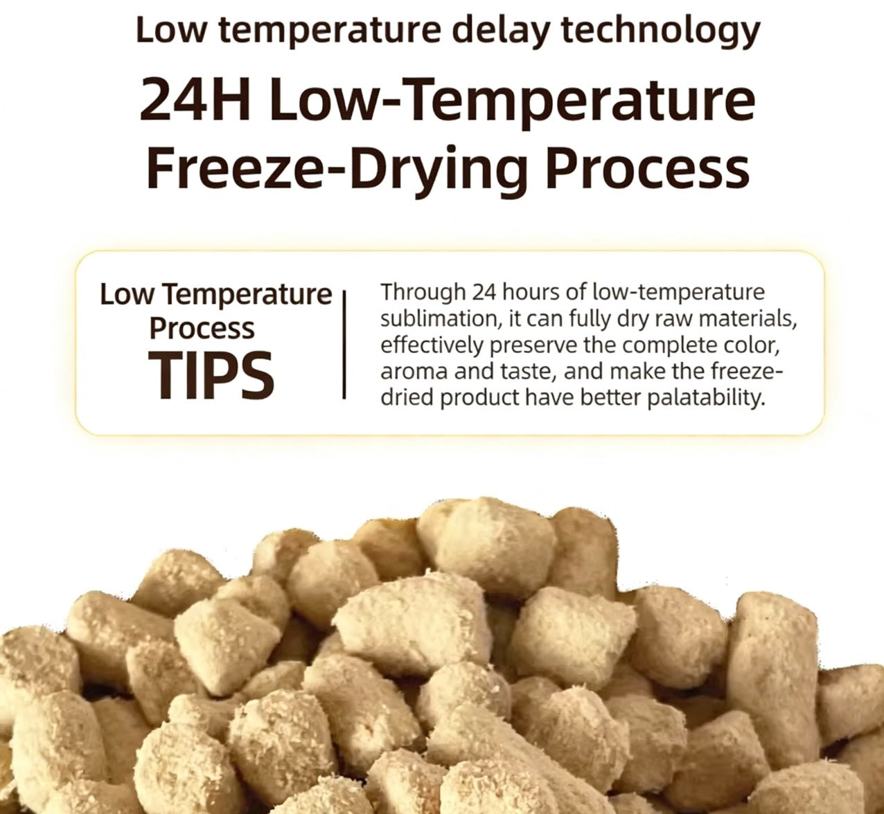 To preserve the natural goodness of these ingredients, we employ a gentle 24-hour low-temperature freeze-drying process. This method locks in vital nutrients and fresh flavor, delivering a high-protein, highly palatable meal that supports your cat's health and vitality.