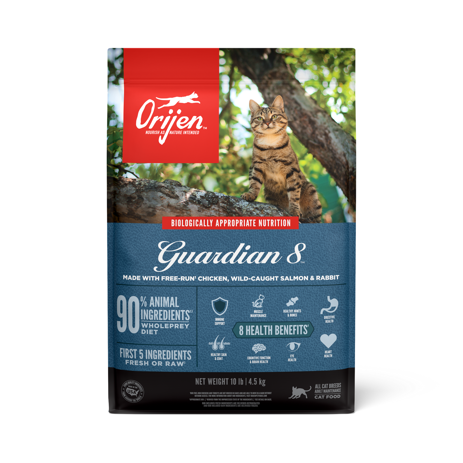 ORIJEN™ Guardian 8™ is a nourishing food specially formulated to address 8 common health concerns through quality ingredients. Because of the abundance of fresh and raw1 WholePrey animal ingredients in this diet, less supplementation is needed to support your cat's health for a lifetime. With 90%2 animal ingredients, Guardian 8 contains nutrient-rich fresh or raw animal ingredients that help support your feline’s health. These key health benefits include Immune Support, Digestive Health Support, Healthy Skin & Coat Support, Muscle Maintenance, Heart Health, Healthy Joints & Bones, Cognitive Function & Brain Health, and Eye Health.