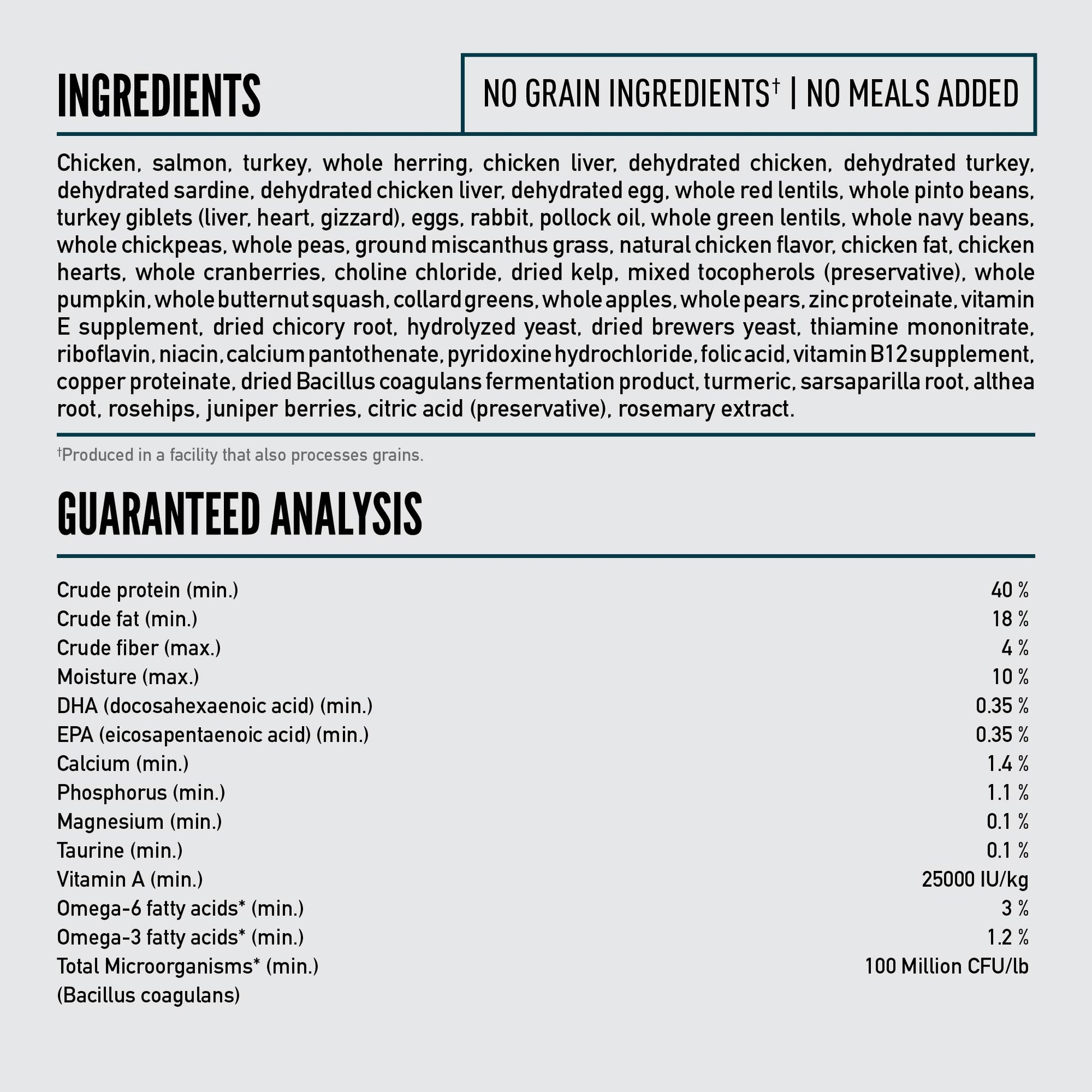 Chicken, salmon, turkey, whole herring, chicken liver, dehydrated chicken, dehydrated turkey, dehydrated sardine, dehydrated chicken liver, dehydrated egg, whole red lentils, whole pinto beans, turkey giblets (liver, heart, gizzard), eggs, rabbit, pollock oil, whole green lentils, whole navy beans, whole chickpeas, whole peas, ground miscanthus grass, natural chicken flavor, chicken fat, chicken hearts, whole cranberries, choline chloride, dried kelp, mixed tocopherols (preservative), whole pumpkin, whole butternut squash, collard greens, whole apples, whole pears, zinc proteinate, vitamin E supplement, dried chicory root, hydrolyzed yeast, dried brewers yeast, thiamine mononitrate, riboflavin, niacin, calcium pantothenate, pyridoxine hydrochloride, folic acid, vitamin B12 supplement, copper proteinate, dried Bacillus coagulans fermentation product, turmeric, sarsaparilla root, althea root, rosehips, juniper berries, citric acid (preservative), rosemary extract.