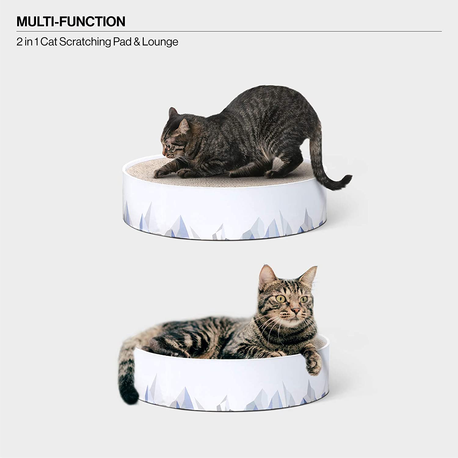 - MULTIFUNCTIONAL SCRATCHER: Lounge & Scratcher 2 in 1. This corrugated cardboard piece doubles as a cat scratcher and a lounge. Satisfy your cat's natural scratching instincts while reducing the risk of damage to your carpets, curtains and furniture. Reclaim your furniture by giving your cat this round Cat Scratcher Bed!